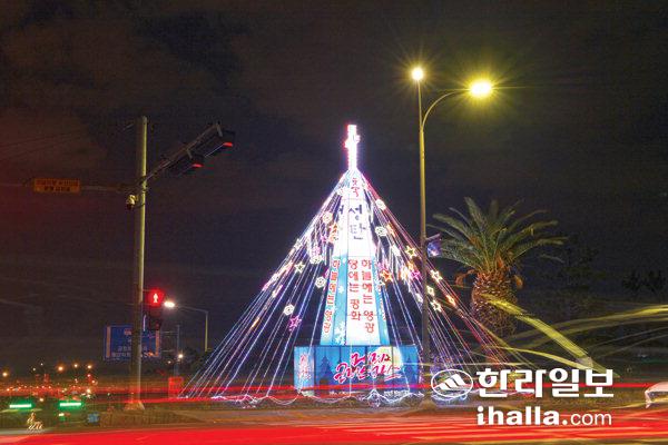 성탄절을 앞둔 지난 5일 제주시 도령마루에 성탄트리가 설치돼 도심을 환하게 밝히고 있다. 이상국기자