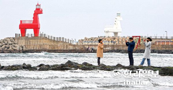 8일 제주시 이호테우해수욕장을 찾은 관광객들이 원담 위에서 사진 촬영을 하고 있다. 이상국기자