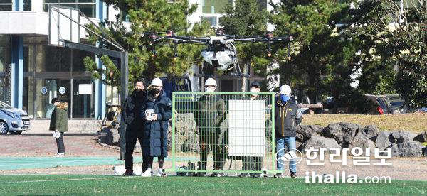 9일 초경량비행장치 국가공인자격증 시험을 앞둔 교육생들이 제주국제대학교 운동장에서 무인헬리콥터를 이용해 비행 연습을 하고 있다. 이상국기자