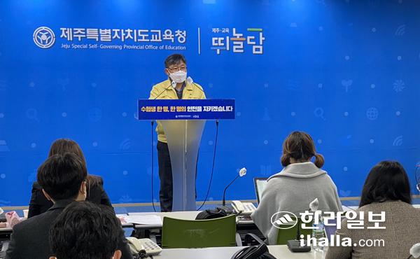 11일 오전 제주도교육청 기자실에서 코로나19 관련 브리핑을 진행하는 이강식 도교육청 안전복지과장.