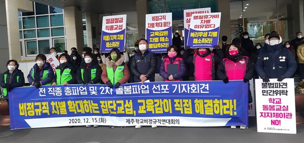 제주학교비정규직연대회의는 15일 제주도교육청 앞에서 기자회견을 열고 "24일부터 돌봄 파업을 비롯해 급식 등 전 직종 총파업을 공식 선포한다"고 밝혔다. 강다혜기자