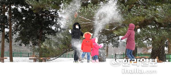 17일 제주 마방목지를 찾은 가족 관광객들이 눈을 던지며 제주의 겨울을 만끽하고있다. 이상국기자