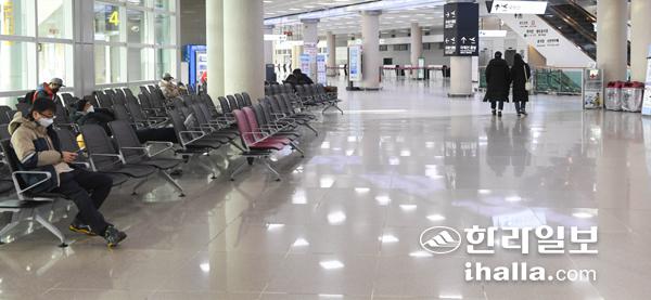 코로나19가 전국적으로 급격하게 확산되고 있는 가운데 제주를 찾는 관광객들이 큰 폭으로 감소하고 있다. 지난 19일 주말임에도 제주국제공항 출·도착장 이용객이 눈에 띄게 줄어들어 한산한 모습이다. 이상국기자
