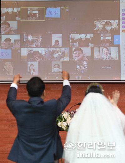 제주형 사회적 거리두기가 2단계로 격상된 가운데 지난 19일 제주시 한 결혼식장에서 하객들이 온라인 화상으로 참여한 결혼식이 진행되고 있다. 이상국기자