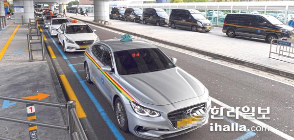 코로나19 대유행으로 제주를 찾는 관광객이 급감하고 있는 가운데 22일 제주국제공항에 택시들이 길게 늘어서있다. 택시는 손님을 태우기 위해 1시간30분 이상 대기를 하는 실정이다. 이상국기자