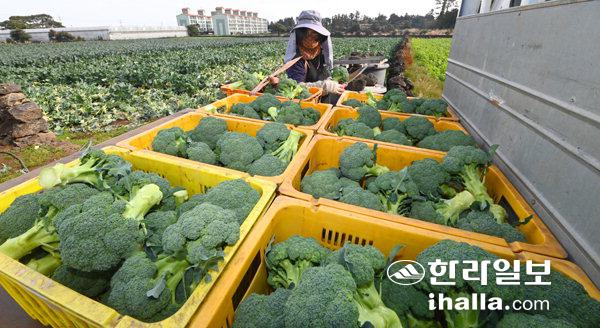 23일 서귀포시 성산읍 소재 한 밭에서 농민들이 정성껏 키운 브로콜리를 수확하고 있다. 이상국기자