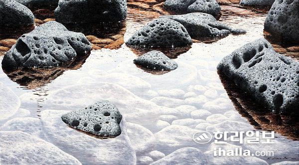 귀향하기 전에 발표한 '시간-이미지'는 제목은 같되 지금 우리가 보는 작품과는 다르다. 당시 '시간-이미지'가 고색창연한 기와를 통해 관념 속 풍파를 그렸다면 2004년부터 천착해온 '시간-이미지'엔 유년의 기억 속 탑동 앞바다 몽돌이 자리하고 있다.
