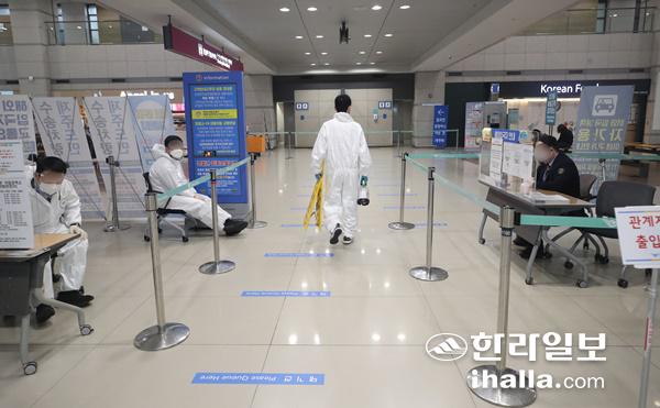 영국발 신종 코로나바이러스 감염증(코로나19) 변이 바이러스가 확산하면서 세계 각국 방역에 비상이 걸린 가운데 29일 오후 영종도 인천국제공항 1터미널 입국장에서 관계자가 소독작업을 위해 들어가고 있다.연합뉴스