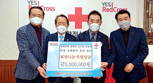 김해김씨 삼현파 복모공 종친회(회장 김태환)는 지난달 30일 대한적십자사제주특별자치도지사(회장 오홍식)를 방문해 코로나19 극복을 위한 성금 500만원을 기탁했다.