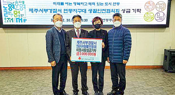 제주서부경찰서 연동지구대 생활안전협의회(회장 신향식)는 지난달 30일 제주사회복지공동모금회(회장 김남식)에 연동 관내 소외계층을 위한 지정기탁금 300만원을 전달했다.