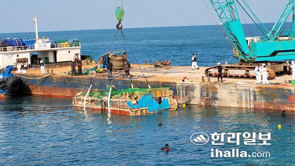 지난달 29일 제주항 북서쪽 해상에서 좌초 후 침몰한 32명민호의 선미가 4일 오전 인양되고 있다. <사진>