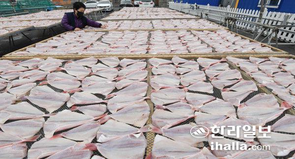 5일 제주시 한림항 인근에서 어민이 장태를 정성스럽게 말리고 있다. 이상국기자