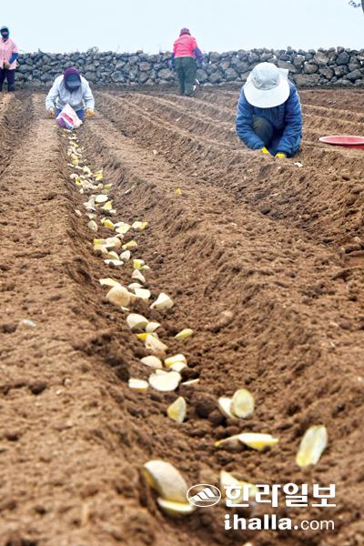 5일 서귀포시 대정읍 한 밭에서 농민들이 감자 파종 작업으로 분주한 시간을 보내고 있다. 이상국기자