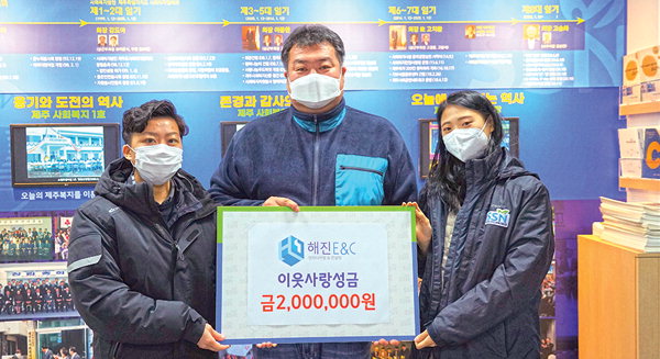 해진이엔씨(대표 고만성)는 최근 제주특별자치도사회복지협의회에 도내 어려운 이웃을 돕는 데 써달라며 이웃사랑 성금 200만원을 기탁했다.