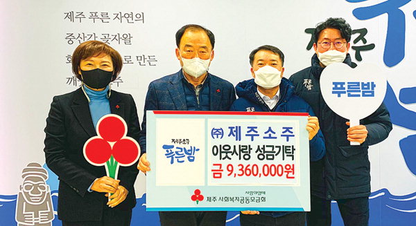 제주소주 임직원들이 지난 한해 동안 매월 일정금액을 기부해 누적된 성금이며, 향토기업으로서 지역사회에 책임을 다하기 위해 지역사회 소외계층에게 따뜻한 마음을 전달하고자 제주사회복지공동모금회에 기부했다.