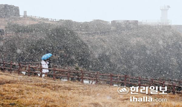 6일 제주 전역에 눈이 내린 가운데 섭지코지가 내리는 함박눈에 갇혀 환상적인 풍경을 연출하고 있다.이상국기자