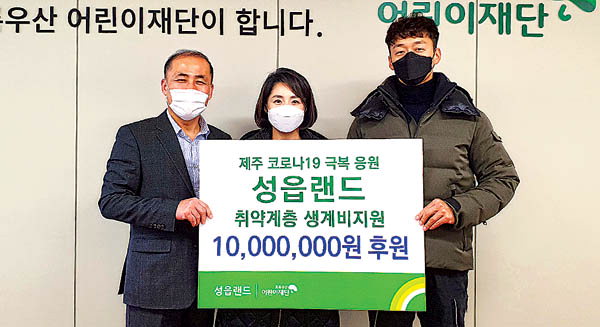 성읍랜드(대표 권재웅·이은주 부부)는 지난 7일 초록우산어린이재단 제주지역본부에 코로나19 극복을 위한 후원금 1000만원을 기탁했다.