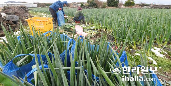 10일 폭설이 그치면서 제주시 애월읍의 한 밭에서 농민들이 대파수확 작업으로 분주한 시간을 보내고 있다. 이상국기자