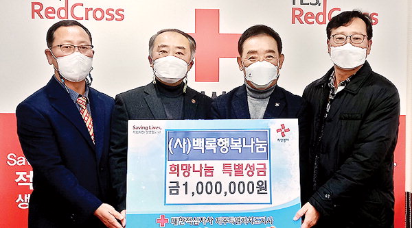 (사)백록행복나눔(회장 김철)은 지난 7일 대한적십자사제주특별자치도지사를 방문해 도내 어려운 이웃을 위해 써달라며 성금 100만원을 전달했다.