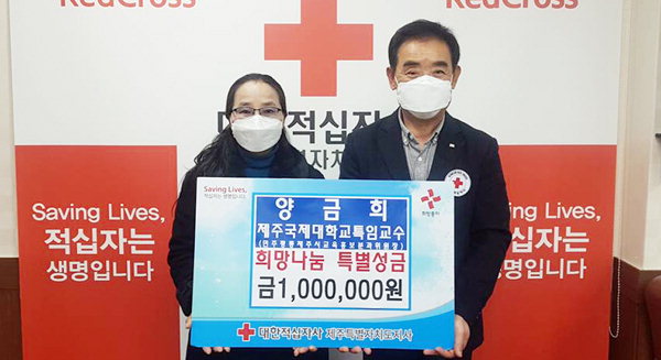 양금희 제주국제대학교 특임교수는 지난 13일 대한적십자사제주도지사를 방문해 소외된 이웃을 돕기 위한 희망나눔 특별성금 100만원을 전달했다.