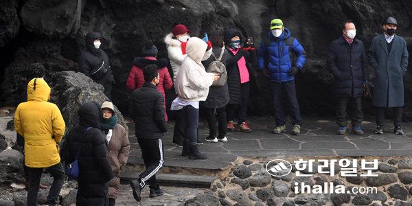 강추위가 찾아온 지난 16일 제주시 용두암을 찾은 관광객들이 해안 절벽에 서서 바람을 피하고 있다. 이상국기자