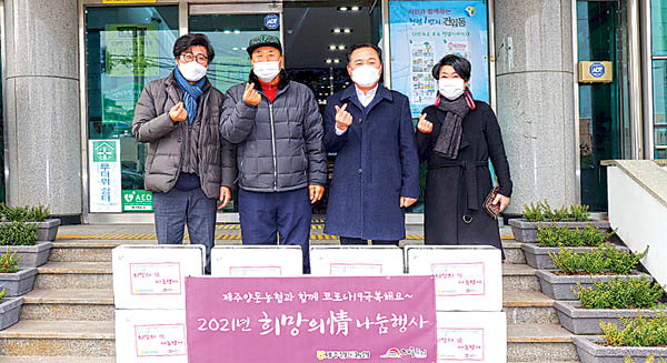 제주양돈농협(조합장 고권진)은 코로나19로 인해 사회적 거리두기, 집합금지 등과 경기침체로 인해 소비심리가 위축되고 있는 가운데 신축년 새해 '희망의 정' 두 번째 나눔 행사를 지난 18일 개최했다.