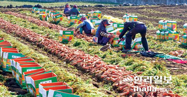 27일 제주시 구좌읍의 한 밭에서 농민들이 지역 특산품인 당근을 수확하고 있다. 이상국기자