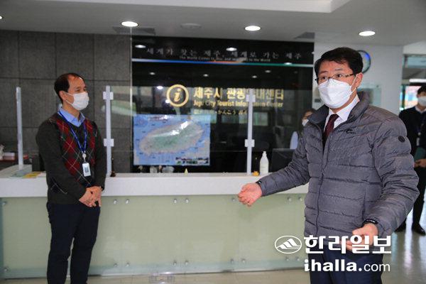 안동우(오른쪽) 제주시장이 28일 제주시 탑동 관광안내소와 용두암 관광안내소 및 공영관광지인 별빛누리공원을 방문해 근무 직원들의 애로사항을 청취하고 격려하고 있다. 사진=제주시 제공
