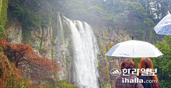 제주 산간지역에 호우경보가 내려진 1일 서귀포시 엉또폭포에 많은 양의 물이 떨어지며 장관을 이루고 있다. 이상국기자
