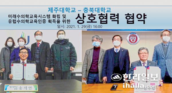 제주대학교(총장 송석언)와 충북대학교(총장 김수갑)는 지난달 29일 화상회의를 통해 미래수의학교육시스템 확립과 유럽수의학교육인증(EAEVE) 획득을 위한 업무협약을 체결했다고 1일 밝혔다.