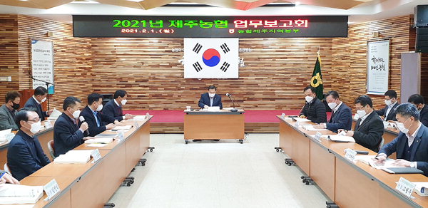 농협제주지역본부(본부장 강승표)는 1일 본부에서 중앙회, 농협은행, 계열사 직원 등이 참석한 가운데 '2021년 범 제주농협 업무보고회'를 열어 2020년 성과와 2021년 경영환경 및 사업방향 공유, 2021년 주요업무계획을 발표했다.