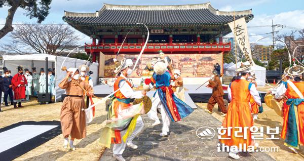 2021 신축년 탐라국입춘굿이 2일부터 3일까지 제주목 관아 일대에서 비대면 온라인 실시간 생중계로 진행되는 가운데 첫날 액을 막고 풍요를 기원하는 '춘경문굿'이 펼쳐지고 있다. 이상국기자
