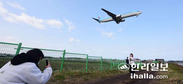 2일 제주공항 인근 제주시 이호동 한 지역에서 관광객들이 착륙하는 비행기를 배경으로 사진을 찍고 있다. 이상국기자