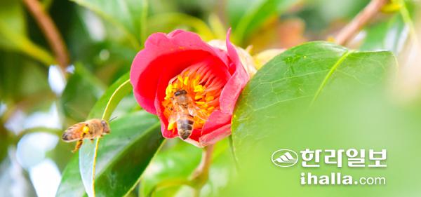 봄같은 포근한 날씨가 며칠째 이어지고 있다. 6일 서귀포시 표선읍 한 주택에 만개한 동백꽃을 찾은 꿀벌들이 꿀을 따느라 분주하게 움직이고 있다. 이상국기자
