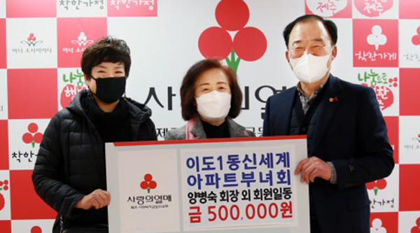 제주시 이도1동 신세계아파트 부녀회(회장 양병숙)는 지난 9일 제주사회복지공동모금회(회장 김남식)를 방문해 관내 어려운 이웃을 돕는데 써달라며 이웃사랑 성금 50만원을 기탁했다.