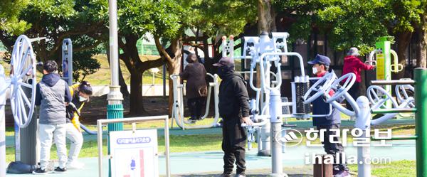 포근한 날씨가 이어진 20일 제주종합경기장 공원을 찾은 시민들이 한결 가벼워진 옷차림으로 운동을 즐기고 있다. 이상국기자
