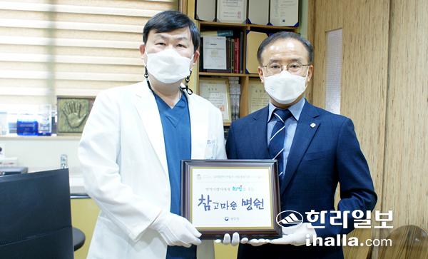 제주지방병무청(청장 문경종)은 9일 '슈퍼힘찬이 프로젝트'의 후원기관인 김기수 秀안과에 '참 고마운 병원' 현판을 전달했다.