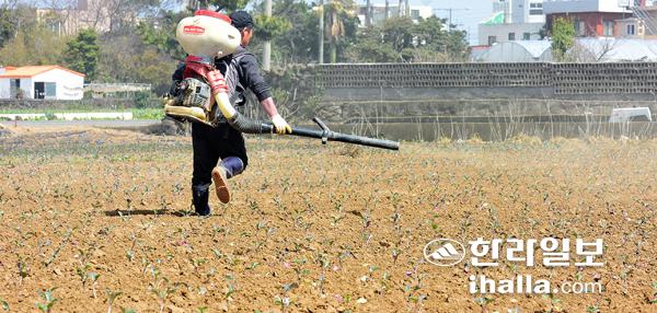 18일 제주시 한경면 브로콜리 밭에서 한 농민이 병충해 방제작업을 하고 있다. 이상국기자