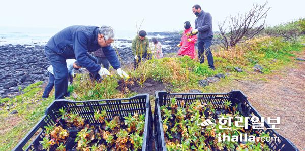 서귀포문화사업회 관계자들이 20일 표선해안가 일대에서 식생복원사업의 일환으로 황근과 암대극, 갯패랭이 등 1500주를 식재했다. 이상국기자