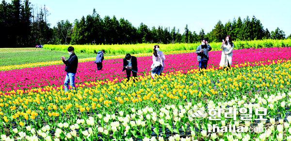 22일 서귀포시 표선면 보롬왓을 찾은 관광객들이 튤립을 배경으로 기념사진을 찍고 있다. 이상국기자