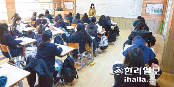 2021년 첫 고등학교 전국학력평가가 실시된 23일 제주시 중앙여고에서 1학년 학생들이 문제를 풀고 있다. 이상국기자