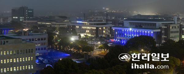29일 제주특별자치도는 제14회 세계 자폐인의 날을 앞두고 청사 벽면에 파란색 조명을 점등했다. 파란색 조명은 내달 8일까지 켜진다. 이상국기자