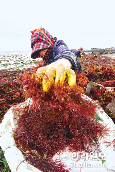 비가 오락가락하는 궂은 날씨를 보인 4일 제주시 구좌읍 종달리 해안가에서 어민들이 우뭇가사리 채취 작업으로 분주한 시간을 보내고 있다. 이상국기자