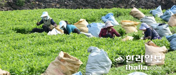 8일 제주시 애월읍 한 밭에서 농민들이 취나물 수확 작업으로 분주한 시간을 보내고 있다. 이상국기자