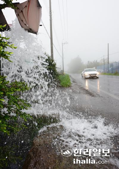 12일 서귀포시 위미리에 많은 양의 비가 내리면서 한 하우스 지붕 물받이에서 빗물이 쏟아져 내리고 있다. 이상국기자