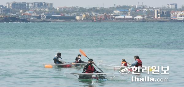 15일 제주시 애월 한담해안을 찾은 관광객들이 청정 제주바다 속을 볼 수 있는 투명카약을 타며 즐거운 시간을 보내고 있다. 이상국기자