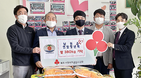 서귀포시 남원읍연합청년회(회장 오경남)가 2021년도 임원 이·취임식에서 축하 화환 대신 받은 쌀 380㎏를 어려운 이웃을 위해 써달라며 남원읍(읍장 현종시)에 기탁했다.