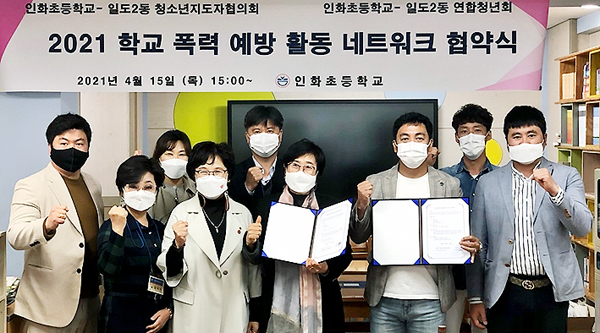 제주시 일도2동연합청년회(회장 김준호)와 인화초등학교(교장 김혜란)는 지난 15일 학교에서 임원 및 직원을 비롯해 강민숙 제주도의회 의원이 참석한 가운데 '2021년 학교 폭력예방활동 네트워크 협약식'을 개최했다.