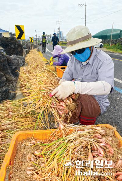 22일 제주시 한림읍의 해안도로에서 지역 농민들이 수확한 쪽파 씨앗 건조 작업으로 분주한 시간을 보내고 있다. 건조된 씨앗은 9월 무렵 파종에 사용된다. 이상국기자