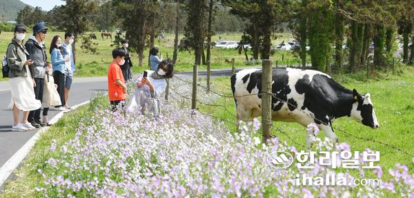 봄을 맞아 제주를 찾는 관광객들이 증가하는 가운데 22일 제주시 한림읍 성이시돌목장을 찾은 관광객들이 방목된 젖소를 구경하고 있다. 이상국기자